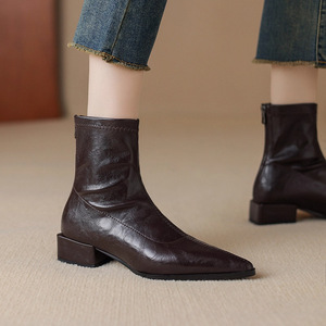 法式尖头低跟棕色弹力瘦瘦靴2025秋冬新款显瘦短靴女复古切尔西靴
