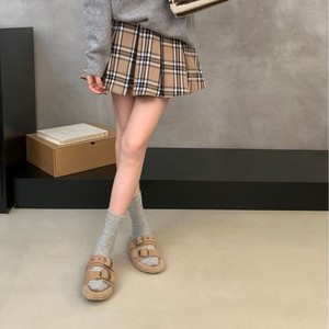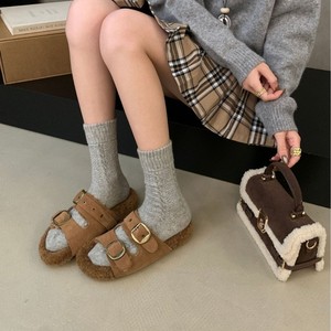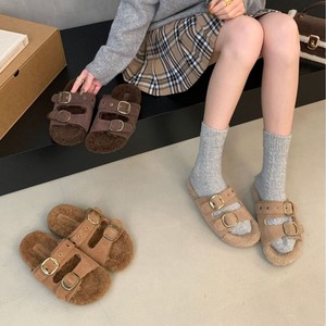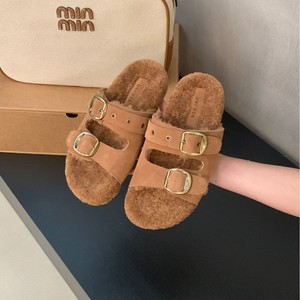 2025新款厚底时尚拖鞋秋冬真皮卡扣调节圆头懒人法式毛毛拖鞋