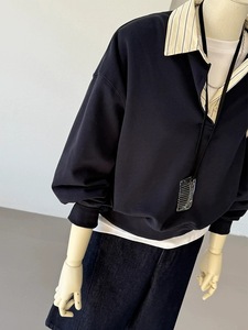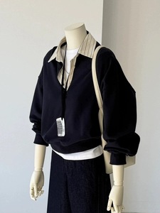 CHAO级推荐!韩版藏青色翻领假两件设计百搭宽松卫衣女