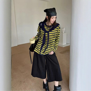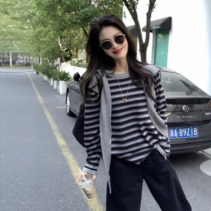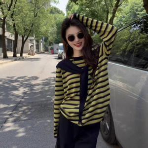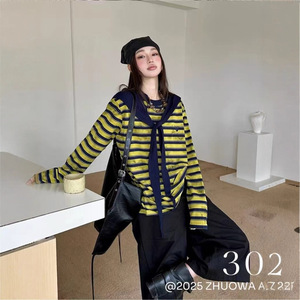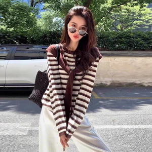 6117小李【上衣两件套】经典条纹针织衫+连帽披肩-不退换