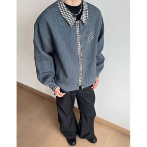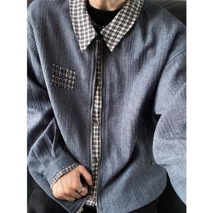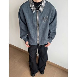 复古假两件千鸟格翻领夹克男2025秋季工装夹克情侣上衣拼接高级感
