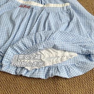 冷调锡蓝 蓝格子套装翻领衬衫花苞裙短裙撞色系带上衣女