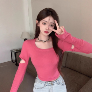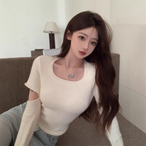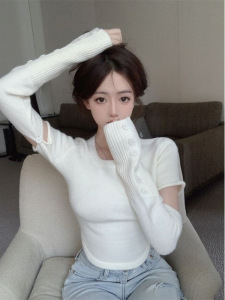 2025秋冬新款套头拼接袖套针织衫短款上衣方领白色百搭打底毛衣女