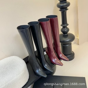 高端2025秋冬真皮尖头复古电镀细跟高跟侧拉链高筒显瘦不过膝长靴
