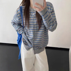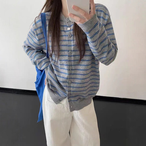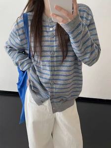 复古撞色条纹开衫外搭毛衣女秋季2025新款慵懒风韩系针织上衣外套