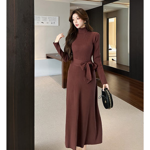 跨境时尚美拉德咖色高领针织连衣裙秋冬修身茶歇法式收腰裙子