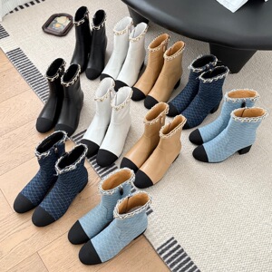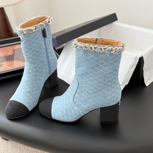 法式小香风圆头粗跟中跟拼色真皮链条短靴女款2025新款秋冬单靴子