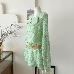 绿色蝴蝶结镂空粗线套头毛衣女秋季2025新款宽松慵懒风软糯针织衫