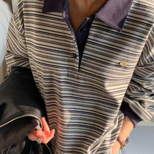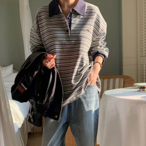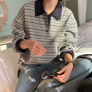 韩国东大门2025秋季新款休闲简约宽松显瘦条纹polo衫卫衣女上衣