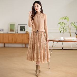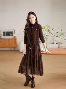 两件套高档针织连衣裙女秋冬新款时尚马甲显瘦长袖套装长裙子绑带