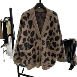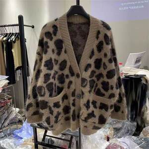 加厚豹纹外套宽松秋冬新款中长款慵懒毛衣女针织开衫废土风多巴胺