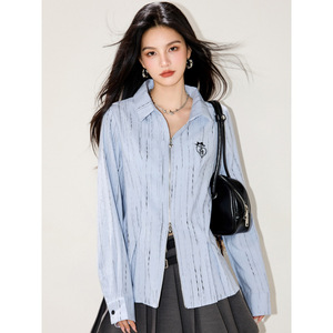 浅蓝色设计感2025年秋季韩版高级感条纹设计双拉链百搭长袖衬衫