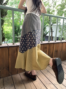 觅定碎花格子拼接半身裙女夏季2025新款高腰显瘦中长款气质裙子
