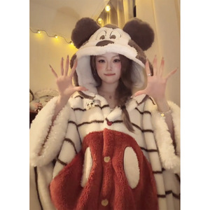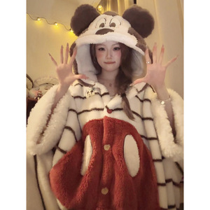 珊瑚绒睡衣条纹可爱米奇睡袍女款2025新款居家服加绒加厚连帽睡裙