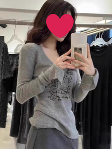 修身显瘦长袖t恤上衣女生春秋超火高级感灰色显白低领内搭针织衫