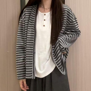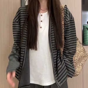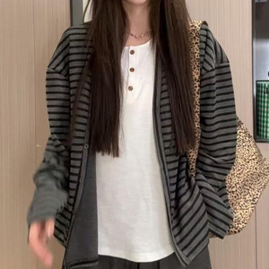 2025秋季新款休闲慵懒风简约百搭宽松条纹开衫外套+背心+长袖其它