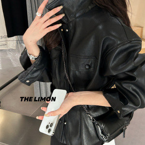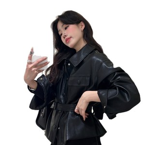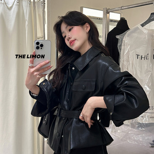 【柠檬绿茶】9157又飒又美复古港风束腰显瘦翻领皮衣(配腰带)