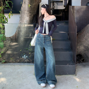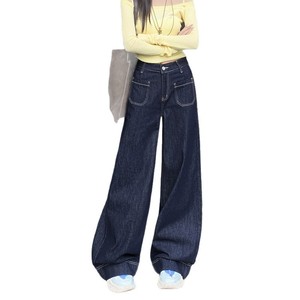 丹宁阔腿牛仔裤女秋季新款高腰宽松显瘦深蓝色窄版高腰直筒裤子潮
