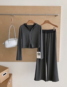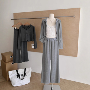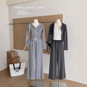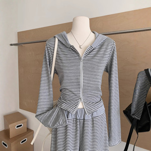 韩系气质简约条纹修身正肩长袖连帽卫衣松紧腰宽松休闲裤套装女秋