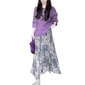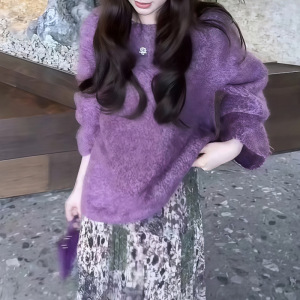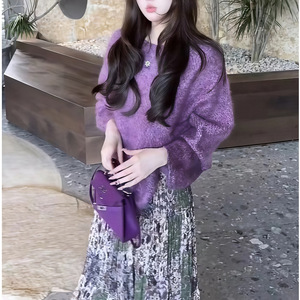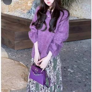 韩系早秋穿搭上衣葡萄紫色慵懒风马海毛毛衣女小个子高级感针织衫
