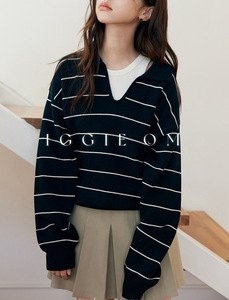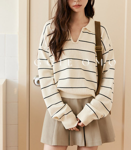 秋冬款韩系高密织法宽条纹翻领莱塞尔时髦套头V领针织衫