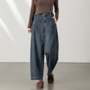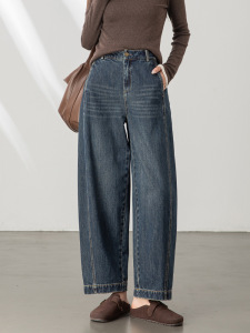 荷然纯棉阔腿弯刀裤女秋季新款复古蓝百搭遮肉九分高腰宽松牛仔裤