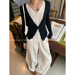 「漫游秋季」秋新款复古V领假两件开衫修身长袖针织衫上衣