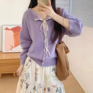 跨境韩系气质软糯针织开衫单排扣百搭花边绑带毛衣女2025新款外套