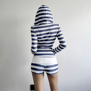 亚马逊欧美休闲风条纹拉链连帽长袖卫衣女运动风修身显瘦百搭外套