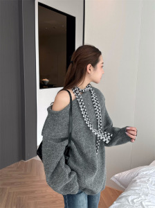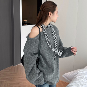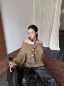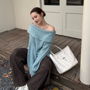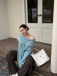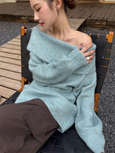 【实拍】羊毛针织衫露肩毛衣宽松慵懒风一字肩秋冬中长款上衣高级