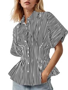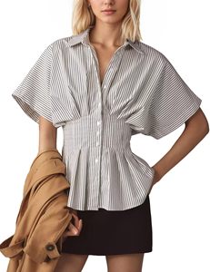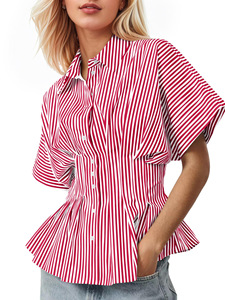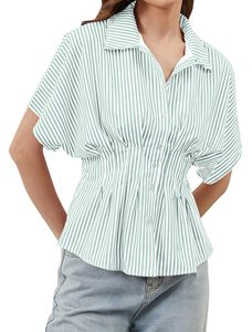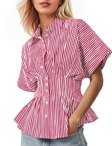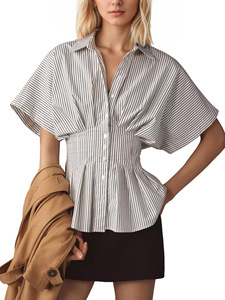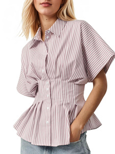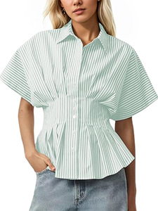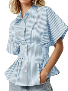 欧美跨境亚马逊2025式条纹衬衫系扣短袖褶皱荷叶边衬衫上衣