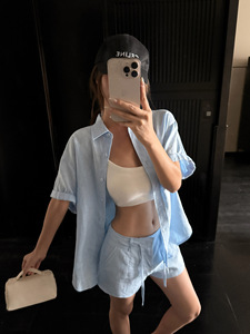 NEVA HU 苎麻衬衫三件套装女慵懒松弛感宽松长袖衬衣阔腿短裤长裤