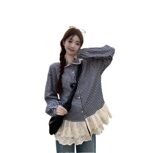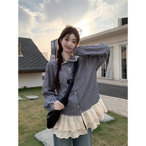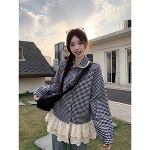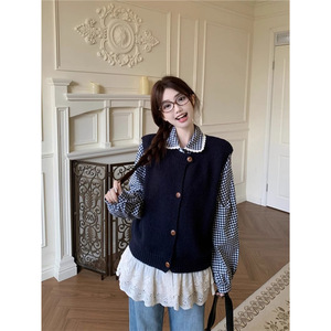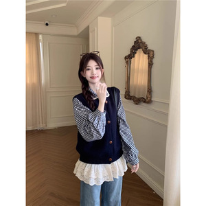 学院风套装女春夏复古减龄圆领针织开衫马甲搭花边格子衬衫两件套