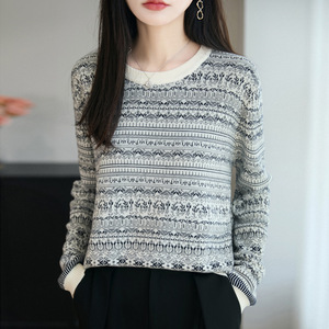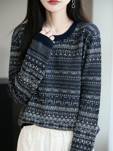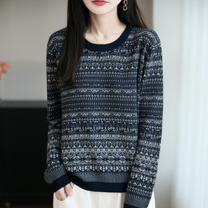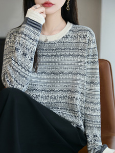 秋冬新款女羊毛衫圆领打底衫撞色青花瓷复古风长袖上衣毛衣针织衫