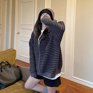 杏色抽绳连帽条纹针织开衫女秋季韩版宽松慵懒凤外穿毛衣衣外套
