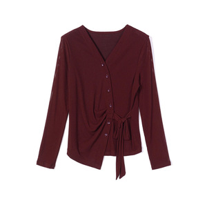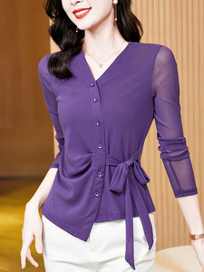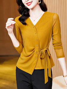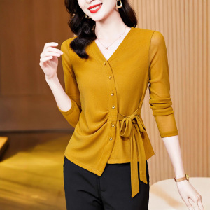 2025秋季新款气质百搭V领纯色网纱长袖系带网纱打底衫t恤女批发
