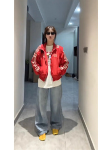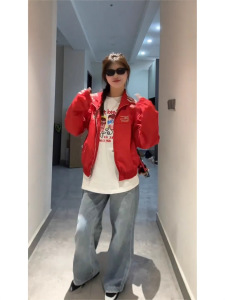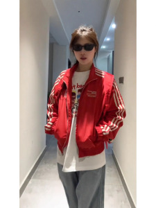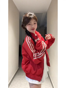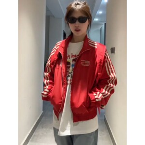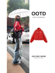 跨境红色三条杠工装外套女春秋薄款高级感休闲宽松设计感小众上衣