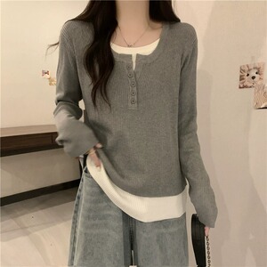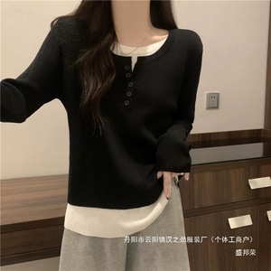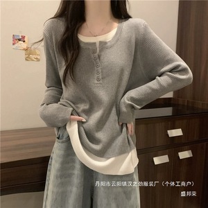 厂家直销大码女装假两件长袖T恤女春秋季设计感小众胖mm宽松显瘦
