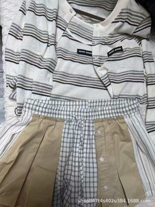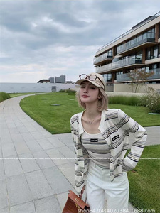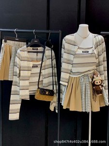 Miu撞色条纹针织吊带休闲薄款长袖防晒开衫上衣加百褶裙三件套装