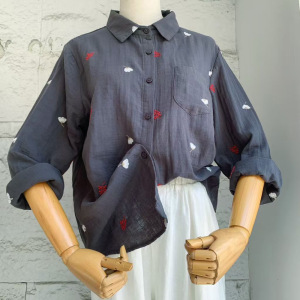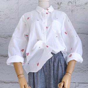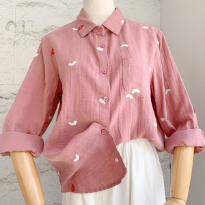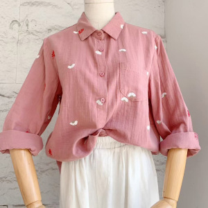 刺绣花朵双层棉纱长袖衬衫女宽松显瘦秋新款文艺休闲百搭翻领衬衣