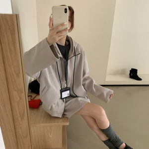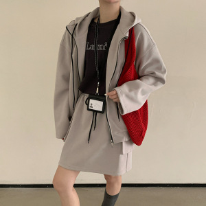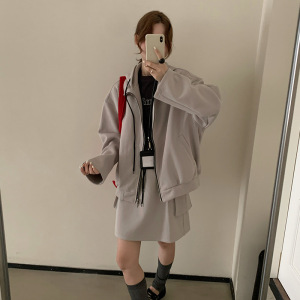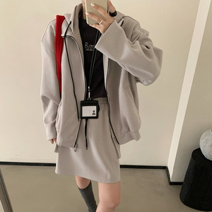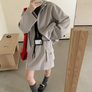 韩国东大门2025秋新款休闲拉链宽松显瘦连帽卫衣短款a字半裙套装
