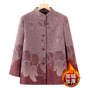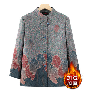 中老年妈妈加绒加厚外套奶奶立领唐装上衣老太太大码舒适时尚外套