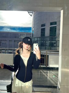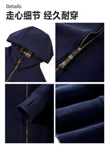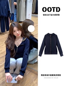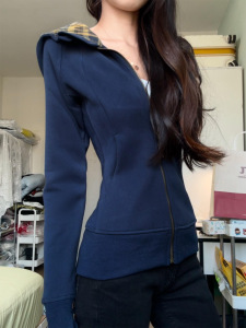 藏青色修身卫衣外套女2025新款开衫秋冬季连帽黄格显瘦设计感上衣