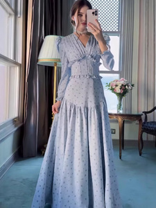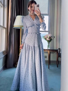 2025年欧美亚马逊外贸秋季新款时尚气质蓝色收腰印花长裙连衣裙