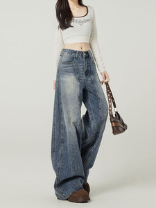 复古蓝高街宽松阔腿牛仔裤女秋季美式设计感小众高腰垂感弯刀裤子