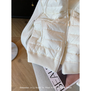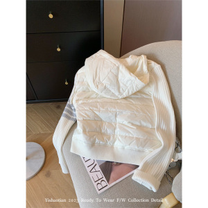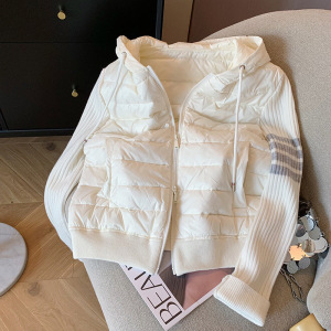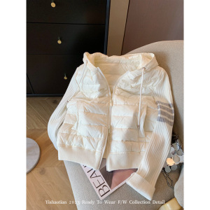 白色四条杠拼接针织连帽棉服女2023秋冬时尚休闲百搭轻薄夹棉外套