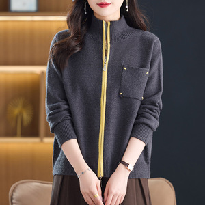 半高领针织双拉链外套女韩系短款收腰显瘦百搭长袖毛衣开衫