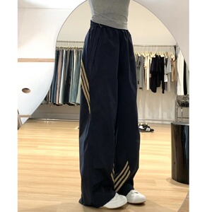 美式复古条纹阔腿裤女2025新款ins宽松直筒抽绳冲锋运动休闲裤春