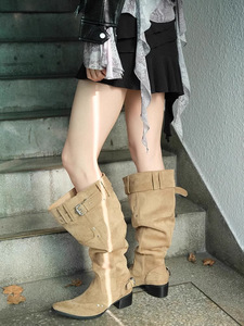 不过膝美拉德长靴女2025年秋季绒面尖头靴子女粗跟显瘦褶皱堆堆靴