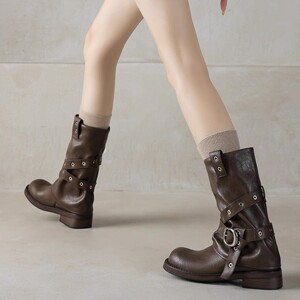 牛皮版~废土风粗跟裤管靴女美拉德靴子真皮西部牛仔靴中筒骑士靴